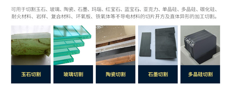 可用于切割玉石、玻璃、陶瓷、石墨、瑪瑙、紅寶石、藍寶石、亞克力、單晶硅、多晶硅、碳化硅、耐火材料、巖樣、復(fù)合材料、環(huán)氧板、鐵氧體等不導(dǎo)電材料的切片開方及直體異形的加工切割